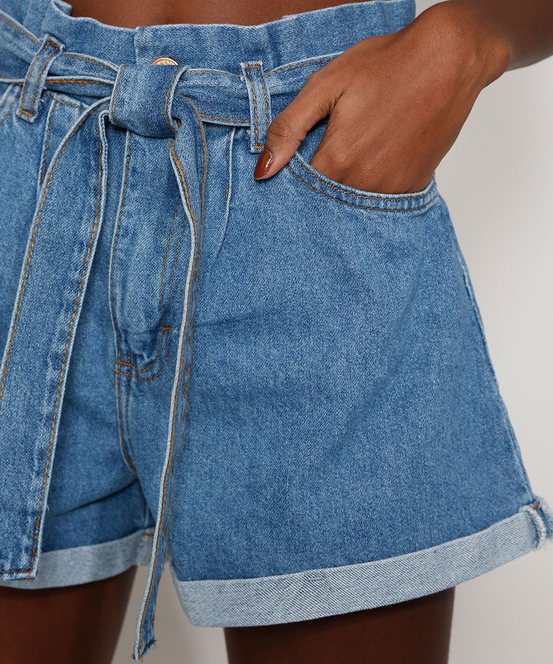 Short Jeans Feminino Clochard Cintura Super Alta com Faixa para Amarrar Azul Médio
